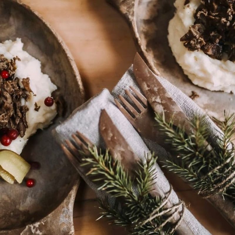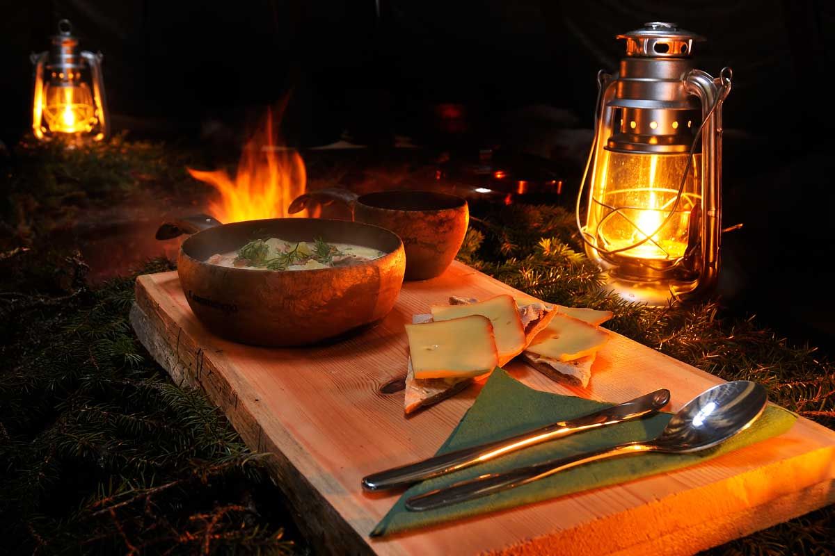 Ein Abendessen mit drei Gängen können Sie in Verbindung mit den Abendprogrammen in der stimmungsvollen lappländischen Kote oder in der alten Rentierstube aus Blockbohlen genießen.