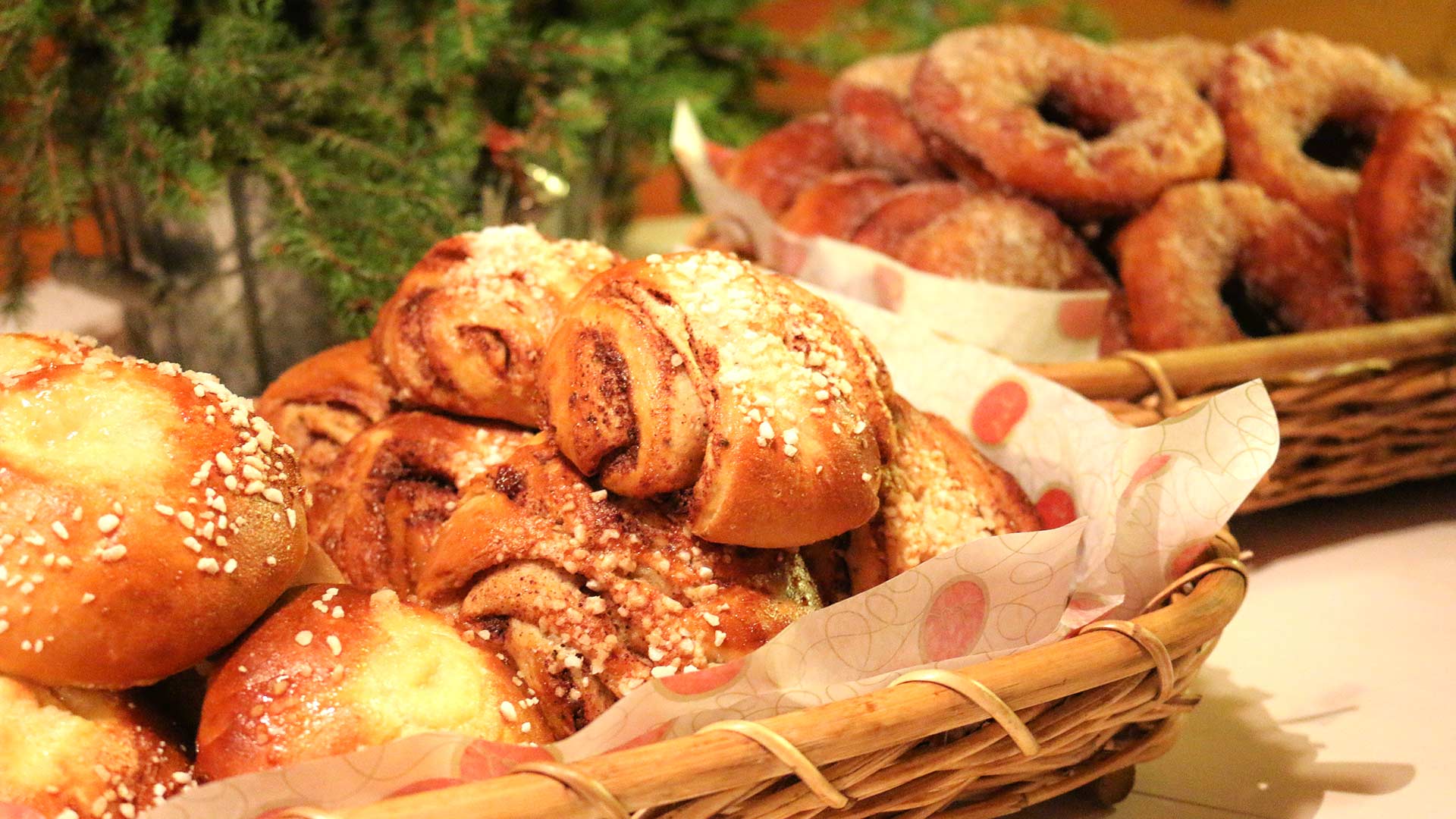 We serve tasty and fresh home-made pastries every day. For starters, savoury reindeer pie with warm drinks, or salmon-filled flatbread for those who favour seafood. Our delicious freshly-baked cinnamon rolls and doughnuts will satisfy your sweet tooth. In spring we cook giant pancakes outside our café.