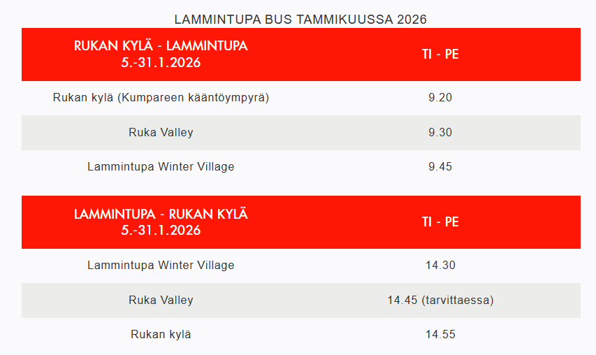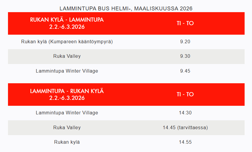 Lammintupa Bus liikennöi Rukan kylästä Ruka Valleyn kautta Lammintuvalle ja takaisin (tarvittaessa myös paluu Ruka Valleyn kautta). Talvella 2025-2026 Lammintupa Bus liikennöi ajalla 5.1.-31.1.2026 tiistaista perjantaihin ja ajalla 2.2.-6.3.2026 tiistaista torstaihin. Yrittäjä pidättää oikeuden ajopäivien muutoksiin.